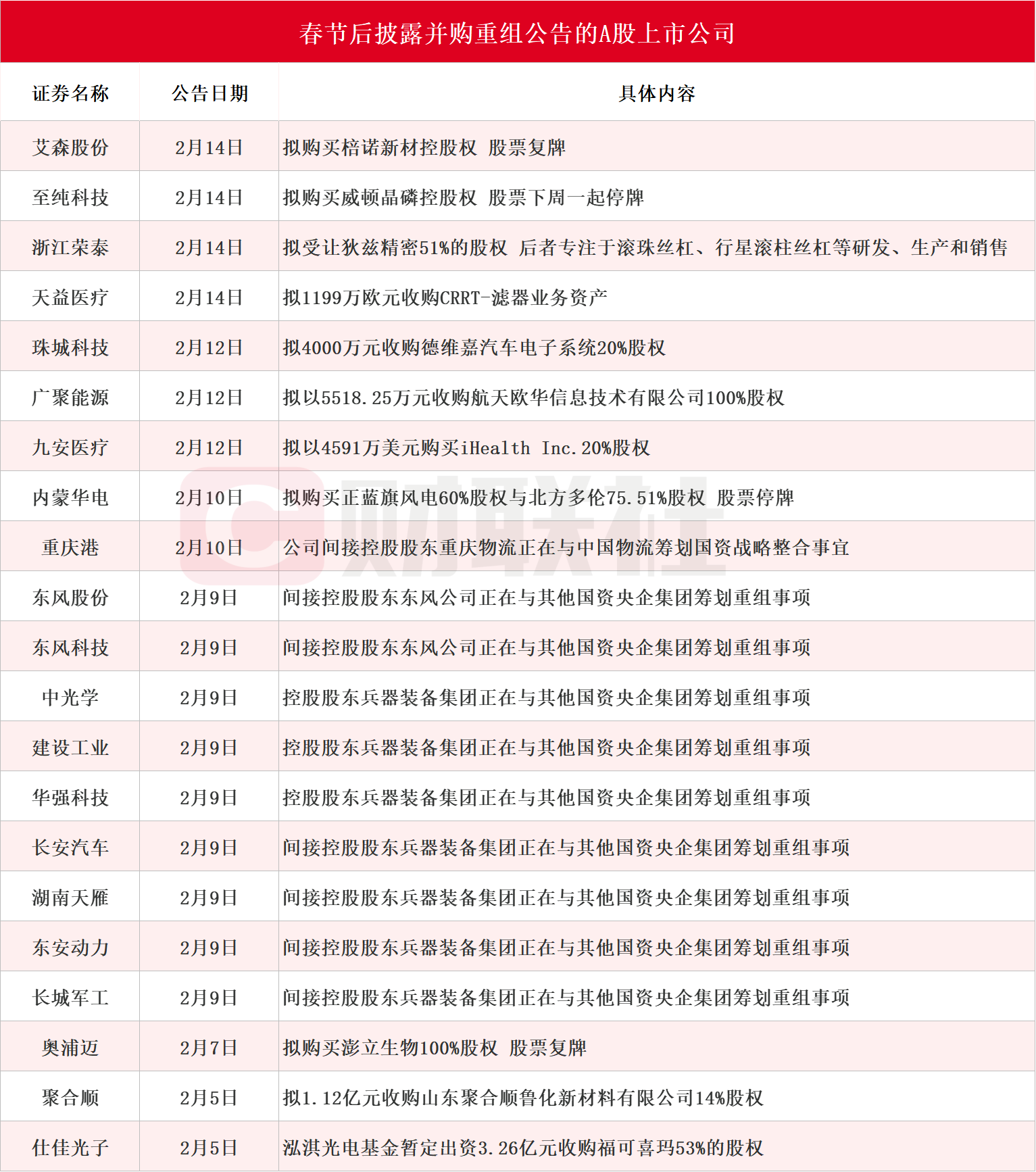 据财联社不完全统计,截至发稿,春节后披露并购重组进展的A股上市公司共有21家,分别为艾森股份、至纯科技、浙江荣泰、天益医疗、珠城科技、广聚能源、九安医疗、内蒙华电、重庆港、东风股份、东风科技、中光学、建设工业、华强科技、长安汽车、湖南天雁、东安动力、长城军工、奥浦迈、聚合顺和仕佳光子,具体情况如下图: