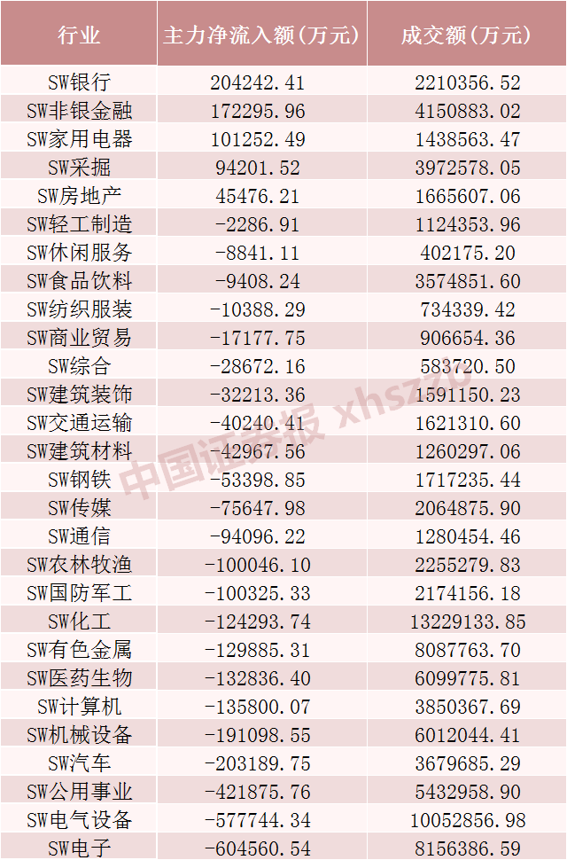 从行业主力资金流向来看,Wind数据显示,今日申万一级行业中,仅有银行、非银金融、家用电器、采掘、房地产行业出现主力资金净流入,分别净流入20.42亿元、17.23亿元、10.13亿元、9.42亿元、4.55亿元;电子、电气设备、公用事业行业主力资金净流出金额居前,分别净流出60.46亿元、57.77亿元、42.19亿元。