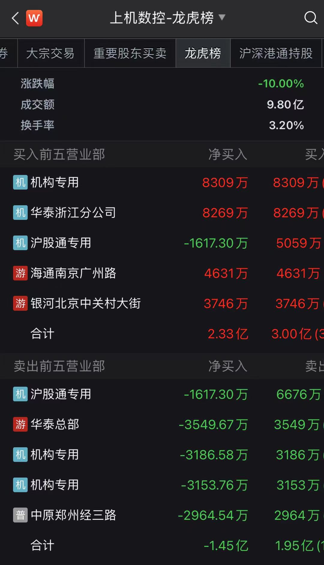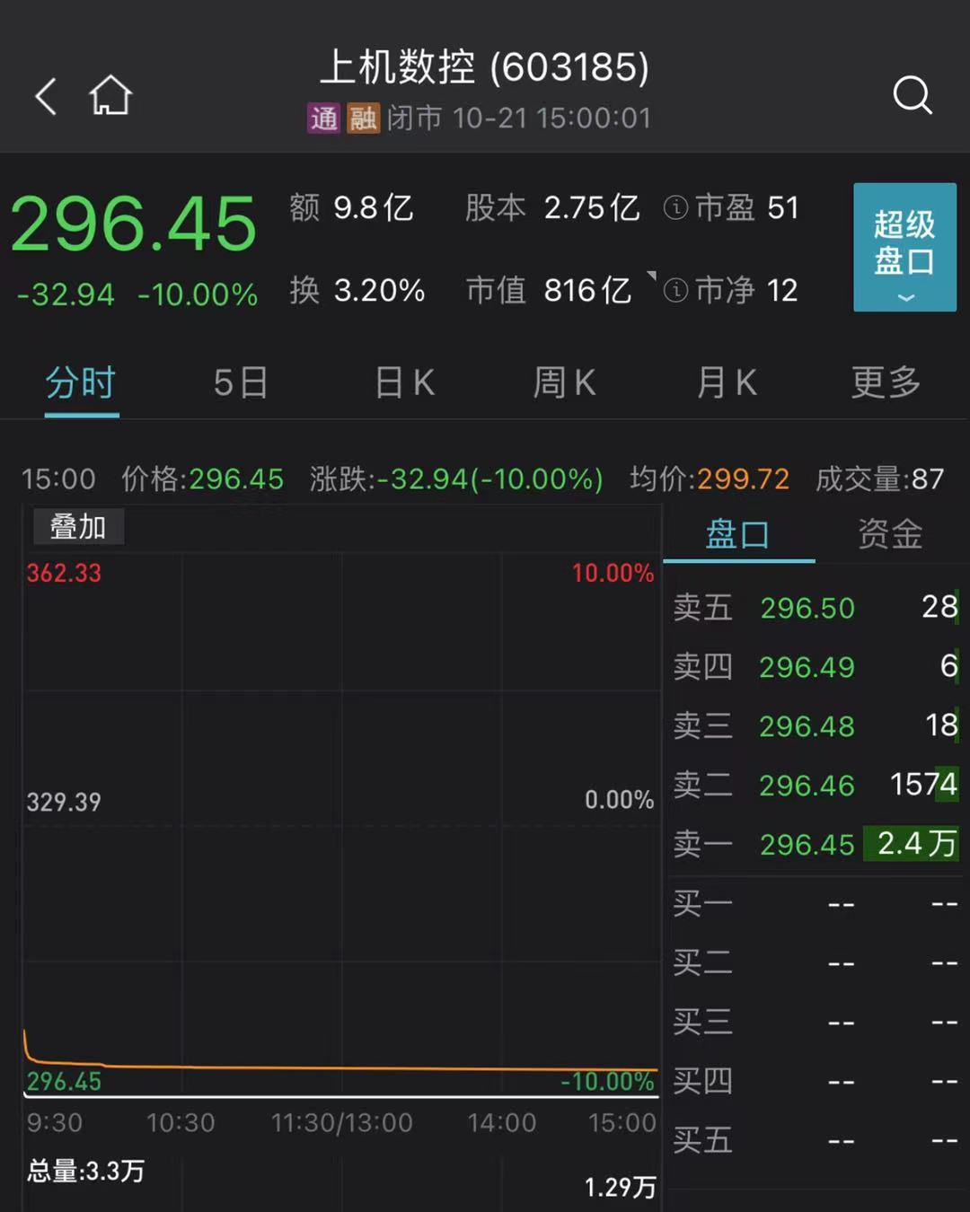 上机数控在昨日公布三季报后,今日大幅低开,开盘后仅1分钟便奔向跌停。截至收盘,上机数控跌停板上的封单为2.4万手,成交额为9.8亿元,总市值为816亿元,今日市值蒸发90.59亿元。Wind数据显示,上机数控从2019月12月创下的16.97元/股的最低价到今年9月的高位,累计涨幅达2010%。从上机数控今日龙虎榜来看,机构分歧巨大,买一的机构席位净买入8309万元,卖三、卖四的两个机构席位合计净卖出6340万元。