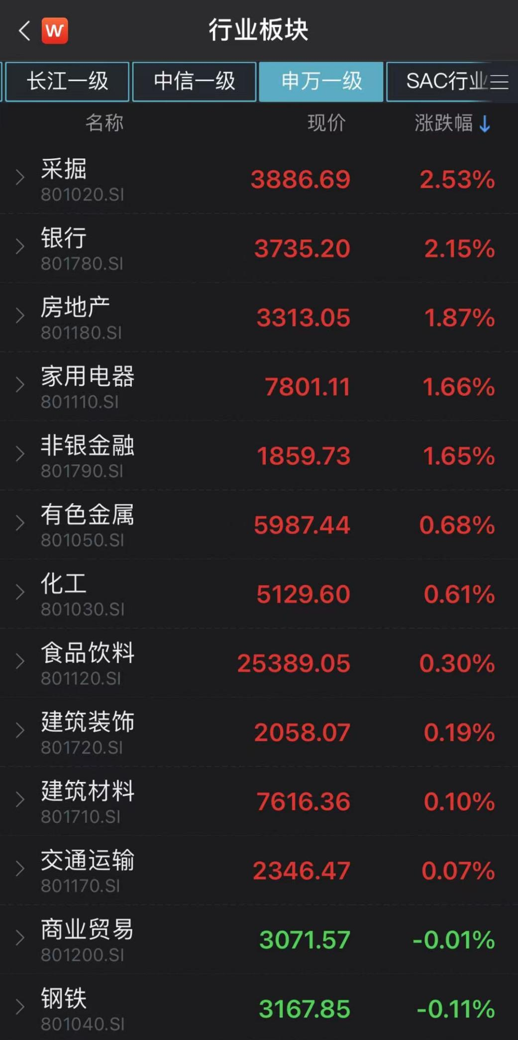 从行业情况来看,申万一级行业中,采掘、银行、房地产行业涨幅居前,分别上涨2.53%、2.15%、1.87%;通信、综合、国防军工行业跌幅居前,分别下跌1.38%、1.33%、1.30%。