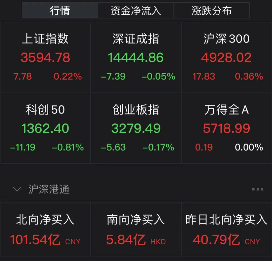 市场成交额缩量,北向资金净买入金额却创逾3个月新高。Wind数据显示,今日北向资金净流入101.54亿元,其中沪股通资金净流入57.08亿元,深股通资金净流入44.46亿元。主力资金净流出251.93亿元。