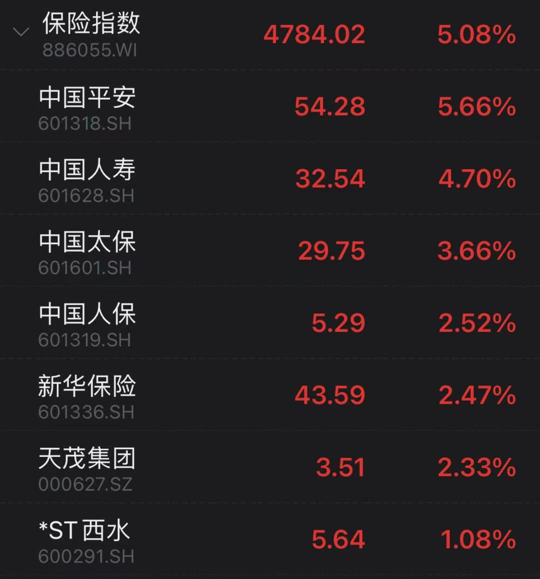 银行、地产、保险等权重板块集体走强,Wind保险指数上涨5.08%,板块内中国平安上涨5.66%,中国人寿上涨4.70%,中国太保上涨3.66%。