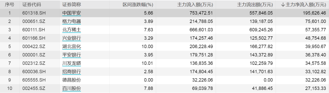 从个股资金流向来看,Wind数据显示,今日中国平安、格力电器、北方稀土主力资金净流入金额居前,分别净流入19.56亿元、7.56亿元、5.74亿元。在今日主力资金净流入金额居前十个股中,有多只金融股。