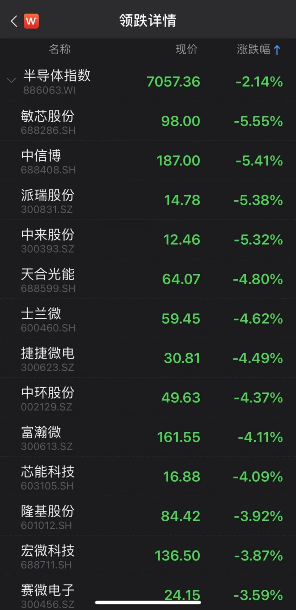 Wind半导体指数下跌2.14%,板块内敏芯股份、中信博、派瑞股份、中来股份跌逾5%,天合光能、士兰微等跌逾4%。