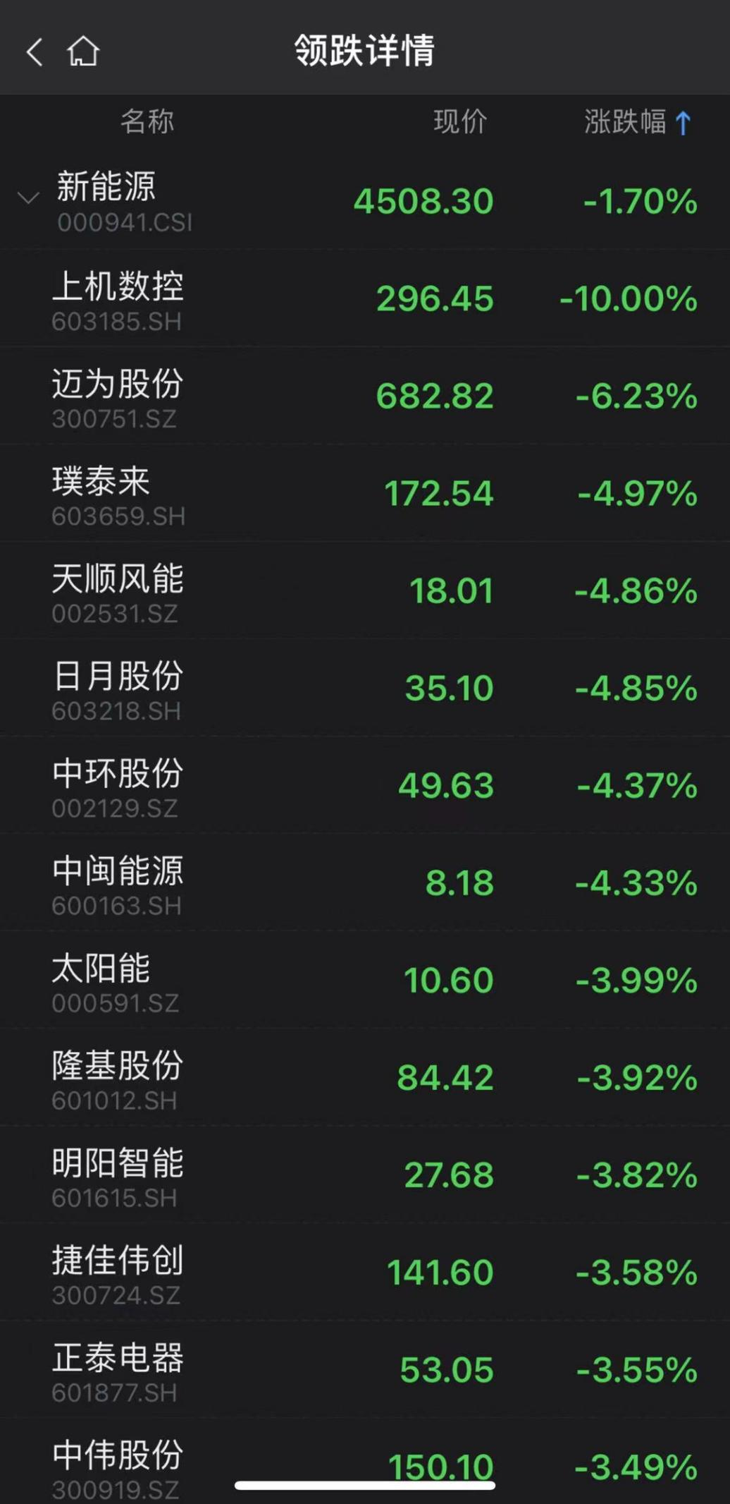 Wind新能源指数下跌1.70%,板块内上机数控跌停,迈为股份跌逾6%。