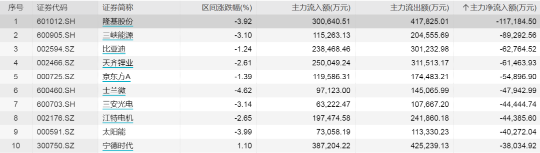隆基股份、三峡能源、比亚迪主力资金净流出金额居前,分别净流出11.72亿元、8.93亿元、6.28亿元。在今日主力资金净流出金额居前十个股中,多数为新能源股票。