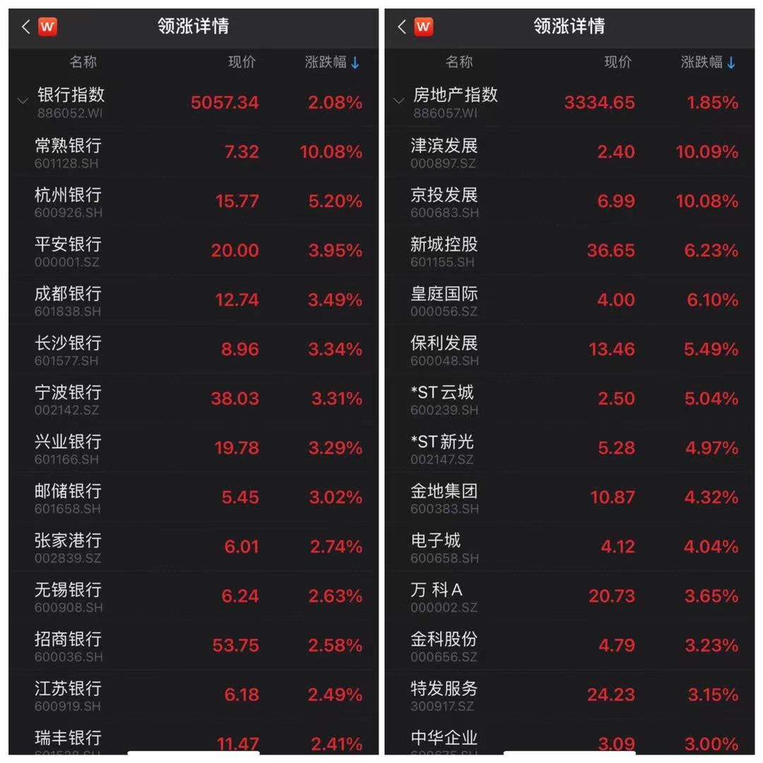 Wind房地产指数上涨1.85%,板块内津滨发展、京投发展、*ST云城、*ST新光涨停,新城控股、皇庭国际涨逾6%。