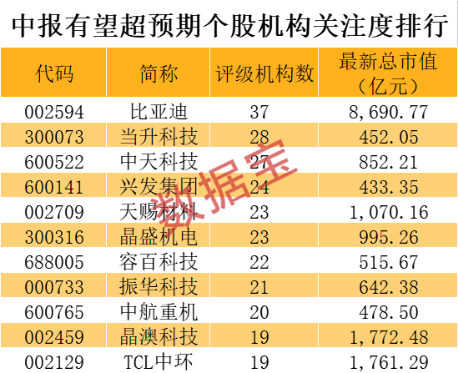 从机构关注度来看,比亚迪有37家机构评级。近期安信证券发布研报称公司7月销量表现超预期,华创证券等券商则认为公司中报预告超预期。此外,当升科技、中天科技、兴发集团、天赐材料、晶盛机电等个股均有20多家机构评级。其中,华鑫证券、中金公司等券商认为当升科技中报预告超预期。