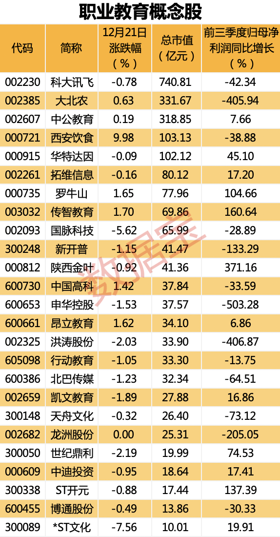 证券时报·数据宝统计,A股中布局职业教育的上市公司共有25家,包括主营业务为教育的上市公司和产教融合型上市公司。12月21日,7只概念股实现上涨,西安饮食涨停,传智教育、罗牛山、昂立教育、中国高科上涨1%以上。