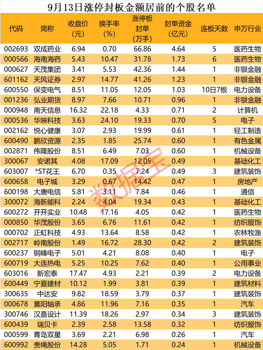以封单金额计算,5股封单金额超1亿元,其中双成药业、海南海药、天茂集团封单金额居前,分别为4.64亿元、1.73亿元、1.44亿元。