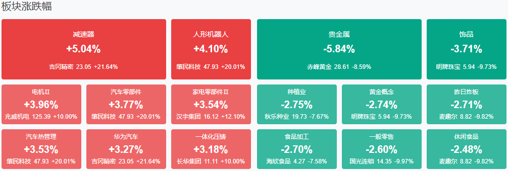 板块方面,机器人、消费电子、家用电器、液冷服务器等板块涨幅居前,黄金、食品、农业、零售等板块跌幅居前。截至收盘,沪指涨0.04%,深成指涨0.7%,创业板指涨1.02%。