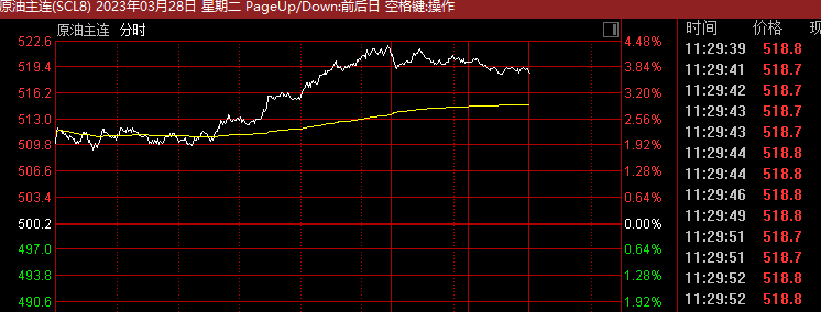 受此影响,上海原油价格夜盘上涨,主力合约2305以521元/桶收盘,上涨20.8元,涨幅为4.16%。截至28日上午收盘,该主力合约报涨3.68%,收于518.6元/桶;燃油主力合约大涨3.94%;沥青涨超3%、乙二醇也涨超2.5%。