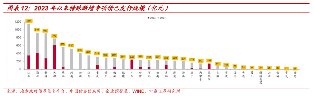 另外,去年至今地方合计发行了新增特殊专项债券超8400亿元,披露规模超9000亿元,用于支持地方化解存量隐性债务和消化政府拖欠企业账款。根据中泰证券研究所数据,32个省市已经发行特殊新增专项债券,具体额度如下图:
