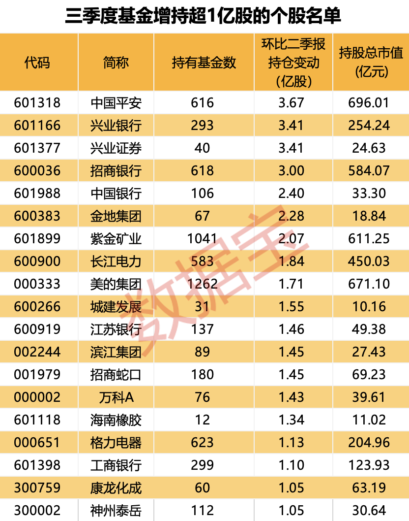 相较二季度末来看,19只个股获基金增持超1亿股。中国平安、兴业银行、兴业证券、招商银行在第三季度中均获得超3亿股加仓。华泰柏瑞沪深300ETF、易方达沪深300ETF在第三季度分别增持中国平安7710.8万股和5183.4万股。