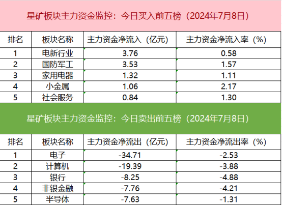 板块资金流出方面,电子板块主力资金净流出居首。