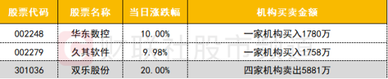 龙虎榜机构活跃度明显下降,财税数字化概念股久其软件获机构买入近2000万;光刻胶概念股双乐股份遭机构卖出超5000万。