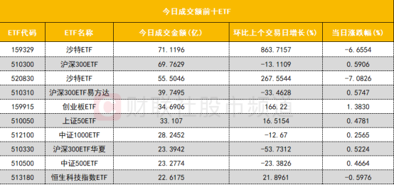 从成交额前十的ETF来看,沙特ETF(159329)成交额位居首位,三只沪深300ETF位居前十行列。