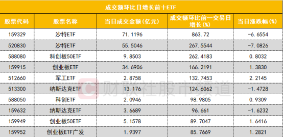 从成交额环比增长前十的ETF来看,前两位均为沙特ETF,其中沙特ETF(159329)成交额环比大增863%位居首位,这两只沙特ETF早盘停牌一小时,复牌后大幅冲高午后快速跳水,最终均大幅收跌。此外,多只科创板、创业部以及纳指ETF位居前十行列。