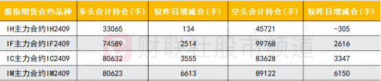 四大期指主力合约中,IF、IC、IM合约多空双方均大幅加仓,IF合约空头加仓数量略多,IC、IM合约多头加仓数量较多;IH多头小幅加仓空头小幅减仓。