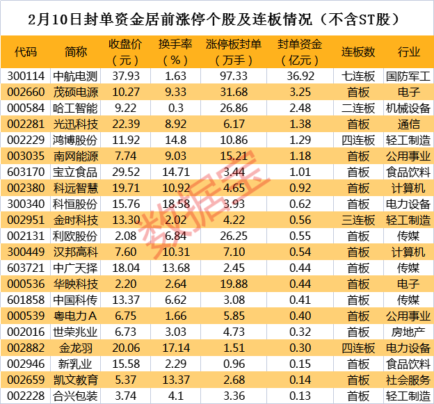 以封单金额计算,中航电测、茂硕电源、哈工智能涨停板封单金额居前,分别为36.92亿元、3.25亿元、2.48亿元。