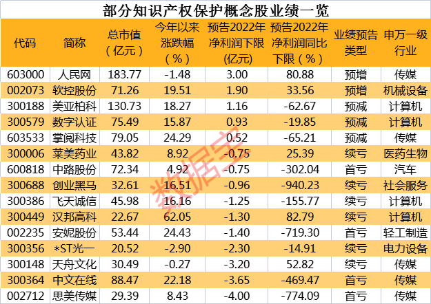 概念股大多处于传媒、电子、计算机行业,目前,16只概念股发布了2022年度业绩预告。业绩预喜个股仅2只,人民网、软控股份业绩预增。