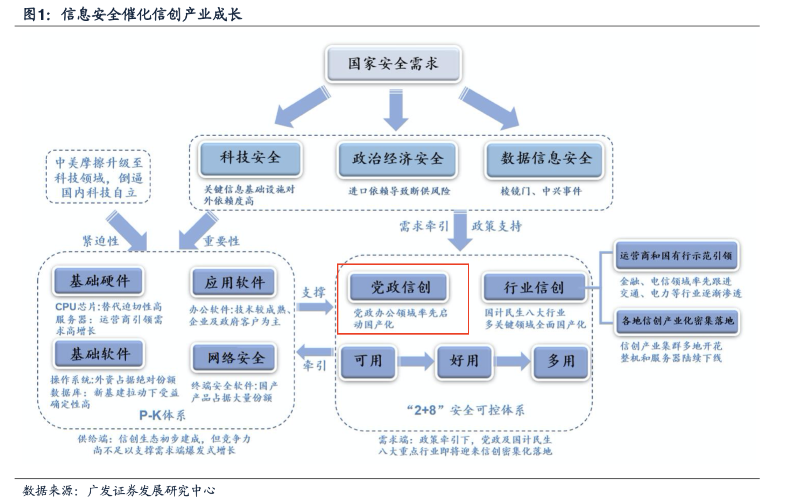 从近期来看,信创已成为引领计算机板块核心主线,正在向政府、金融等各大行业加速扩散。对此,广发证券倪赓等人在11月8日研报中表示,当前信创产业满足实现突破性成长要素,党政信创率先发力的逻辑增强,政策上优先布局党政信创且当前出现加速,国务院10月28日发布《全国一体化政务大数据体系建设指南》提到,完善“1+32+N”的总体架构,“1”即是国家政务大数据平台。