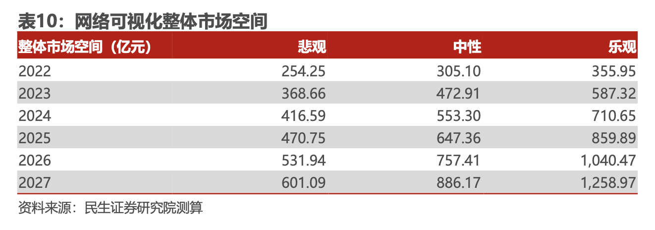 当前,我国数据流量持续爆发辅以国家信息安全刚需加持,且广发证券认为,在国家安全加码下,第三次信创产业浪潮已至。网络可视化市场规模加速,据观研天下预测,我国的网络可视化市场规模至2024年可突破500亿。此外,民生证券吕伟测算,结合5G全面落地在即,在中性及乐观视角下,网络可视化整体市场2027年将分别约为886亿元与1259亿元。