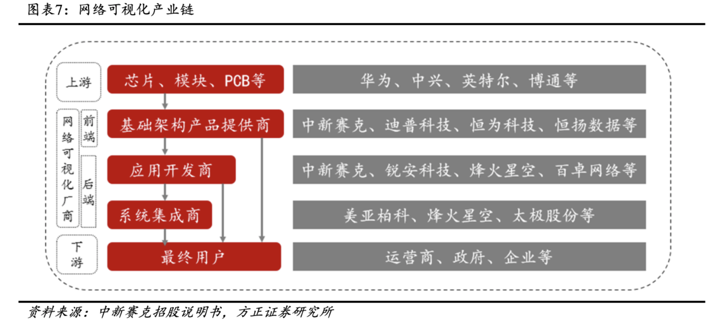 产业链方面,网络可视化上游为原料供应商,中游为网络可视化厂商,下游则是最终用户。