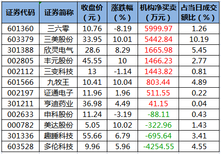 盘后龙虎榜数据显示,今日机构席位资金合计净买入约1.2亿元。其中,净买入的个股8只,净卖出的个股4只。机构净买入最多的股票是三六零,净买入金额约5999.97万元;机构净买入居前的还有三美股份、欣灵电气、丰元股份等股。机构净卖出最多的股票是多伦科技,净卖出金额约4254.55万元;机构净卖出居前的还有趣睡科技、美达股份等股。