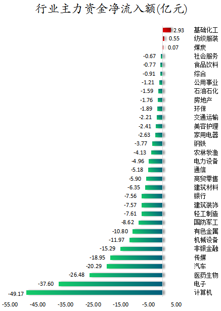 从行业板块来看,申万所属的31个一级行业,今日仅有基础化工、纺织服装、煤炭3个行业板块主力资金呈现净流入,净流入金额分别为2.93亿元、0.55亿元、0.07亿元。28个行业板块主力资金呈现净流出,其中,计算机行业板块主力资金净流出最多,净流出金额为49.17亿元;行业板块主力资金净流出靠前的还有电子、医药生物、汽车、传媒、非银金融,净流出金额分别为37.6亿元、26.48亿元、20.29亿元、18.95亿元、15.29亿元。