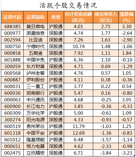 活跃个股方面,北向资金今日净买入的有复旦微电、浪潮信息、比亚迪、宁德时代、五粮液,净买入金额分别为2.75亿元、1.77亿元、1.63亿元、1.48亿元、1.11亿元。北向资金净卖出较多的有立讯精密、格力电器、隆基绿能、中国平安、贵州茅台,净卖出金额分别为3.84亿元、2.33亿元、1.57亿元、1.36亿元、1.03亿元。