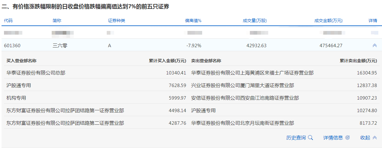 三六零今天跌8.19%。盘后数据显示,1个机构出现在龙虎榜单上,净买入约5999.97万元;华泰证券股份有限公司总部买入1.03亿元;沪股通专用席位买入7628.59万元,同时卖出1.03亿元;兴业证券股份有限公司厦门湖里大道证券营业部卖出1.28亿元。