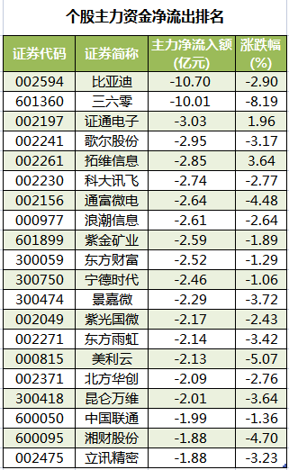 此外,3265只个股被主力资金净卖出,其中,50股被主力资金净卖出超1亿元。主力资金净流出最多的个股是比亚迪,净流出金额为10.7亿元;主力资金净流出居前的个股还有三六零、证通电子、歌尔股份、拓维信息、科大讯飞,净流出金额分别为10.01亿元、3.03亿元、2.95亿元、2.85亿元、2.74亿元。