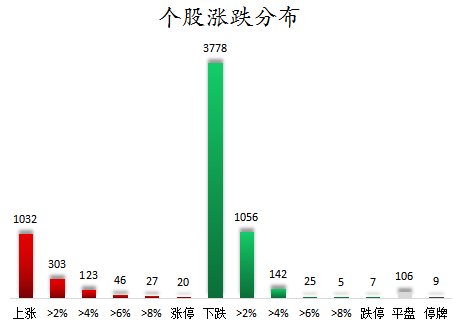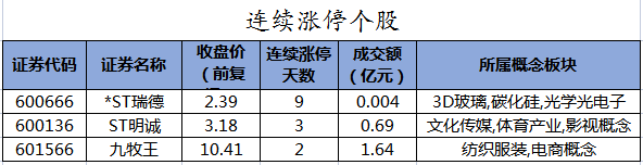 截至收盘,沪深两市合计1032只个股上涨,3778只个股下跌,平盘个股106只,停牌的个股9只。不含当日上市新股,共有20只个股涨停,7只个股跌停。连续涨停天数看,*ST瑞德已连收9个涨停板,连续涨停板数量最多。