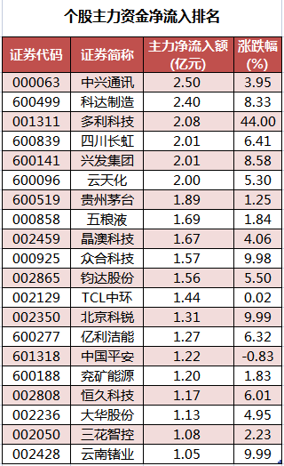 个股来看,今日有1645只个股获主力资金净流入,其中,21股获主力资金净流入超1亿元。中兴通讯获主力资金净流入最多,净流入金额为2.5亿元;主力资金净流入居前的个股还有科达制造、多利科技、四川长虹、兴发集团、云天化,净流入金额分别为2.4亿元、2.08亿元、2.01亿元、2.01亿元、2亿元。