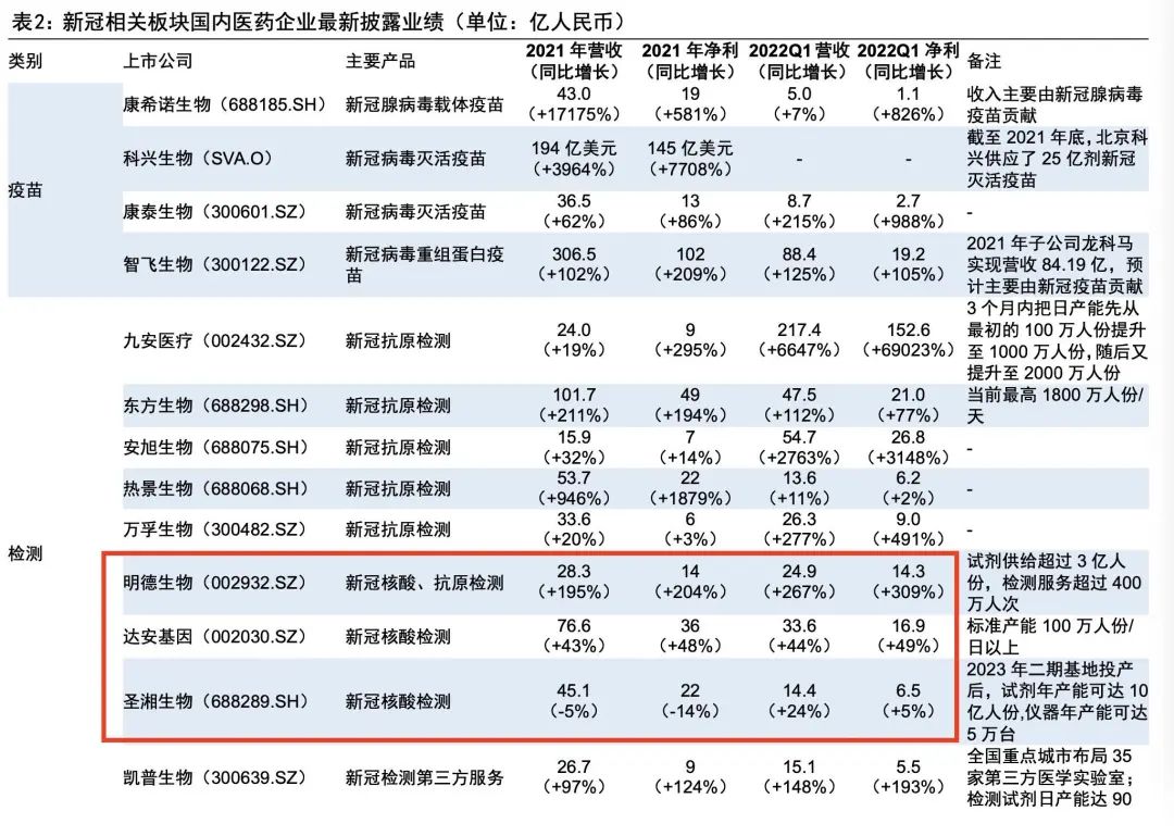 另外,抗原检测试剂盒业务正逐渐成为行业内一块新的“香饽饽”。其中,包括核酸检测龙头明德生物在内的多家企业相继布局该领域。今年一季度,明德生物净利同比增长309%,大幅领先达安基因和圣湘生物。