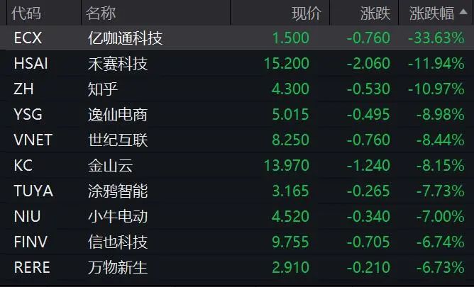 纳斯达克金龙中国指数收跌3.11%,热门中概股普遍下跌,禾赛科技跌近12%,小马智行跌逾11%,盛美半导体、世纪互联、金山云均跌超8%。