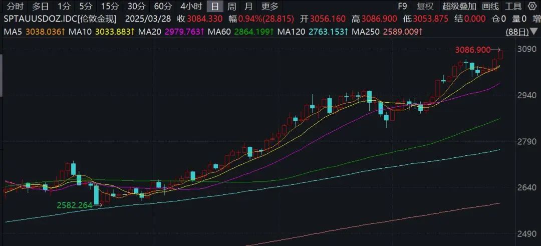 国际金价上涨,现货黄金涨0.94%,报3084.33美元/盎司;COMEX黄金期货6月合约涨0.59%,报3116.6美元,本周累计上涨2.26%;均继续创历史新高。