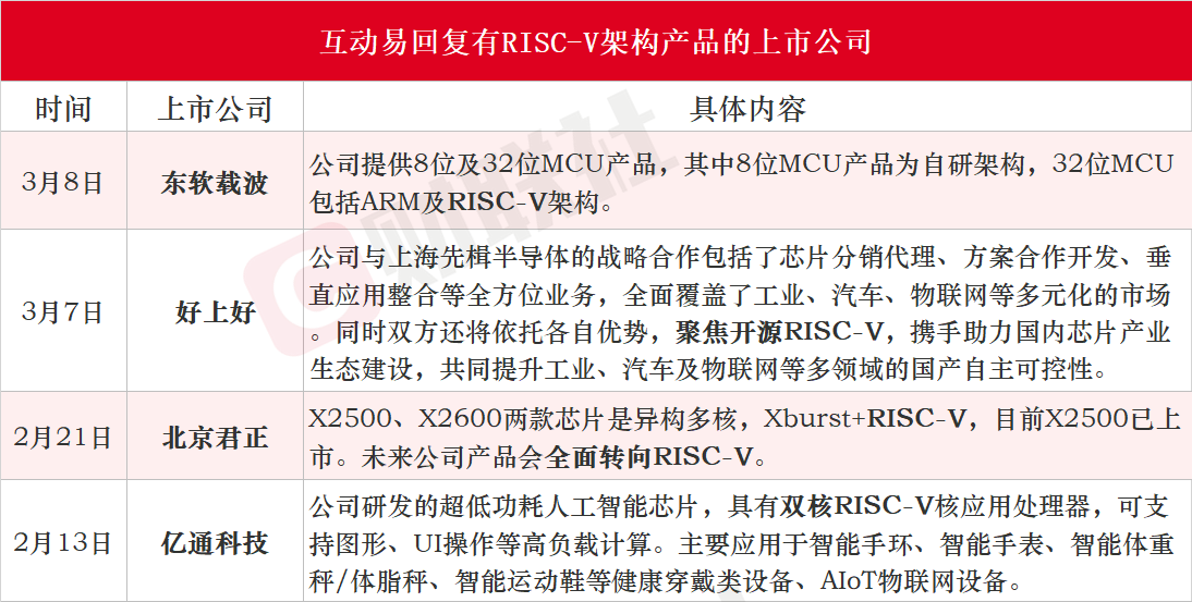 2月中旬以来,东软载波、好上好、北京君正、亿通科技在互动易上表示有RISC-V架构相关产品。