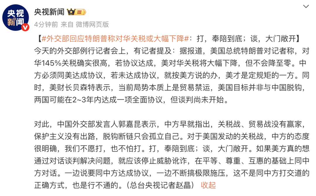 特朗普称对华关税或大幅下降!外交部回应→