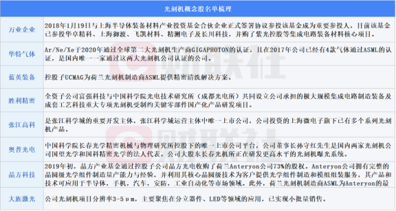 另据财联社不完全统计梳理,A股光刻机概念股名单具体有万业企业、华特气体、蓝英装备、胜利精密、张江高科、奥普光电、晶方科技和大族激光。