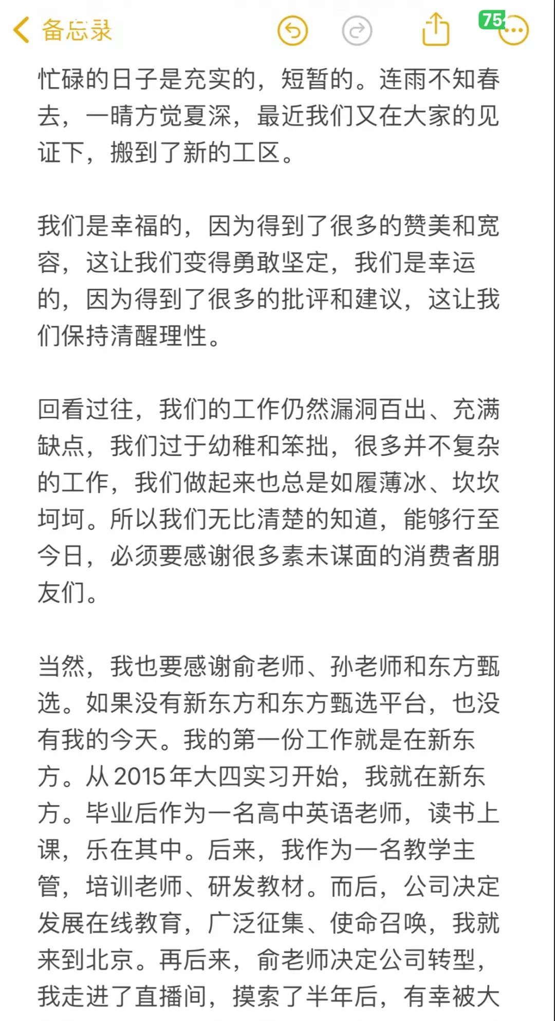 董宇辉表示,“我们相信,缘分不会结束,我们也由衷的祝愿:俞老师、东方甄选,未来一切都好,与辉同行也愿意为此做出一切努力。”