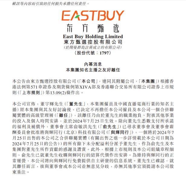 7月25日晚间,东方甄选在港交所公告称,经与公司友好讨论后,董宇辉(公司雇员及中国直播电商行业的知名主播)已决定不再担任公司雇员及公司一个合并联属实体的高级管理层。