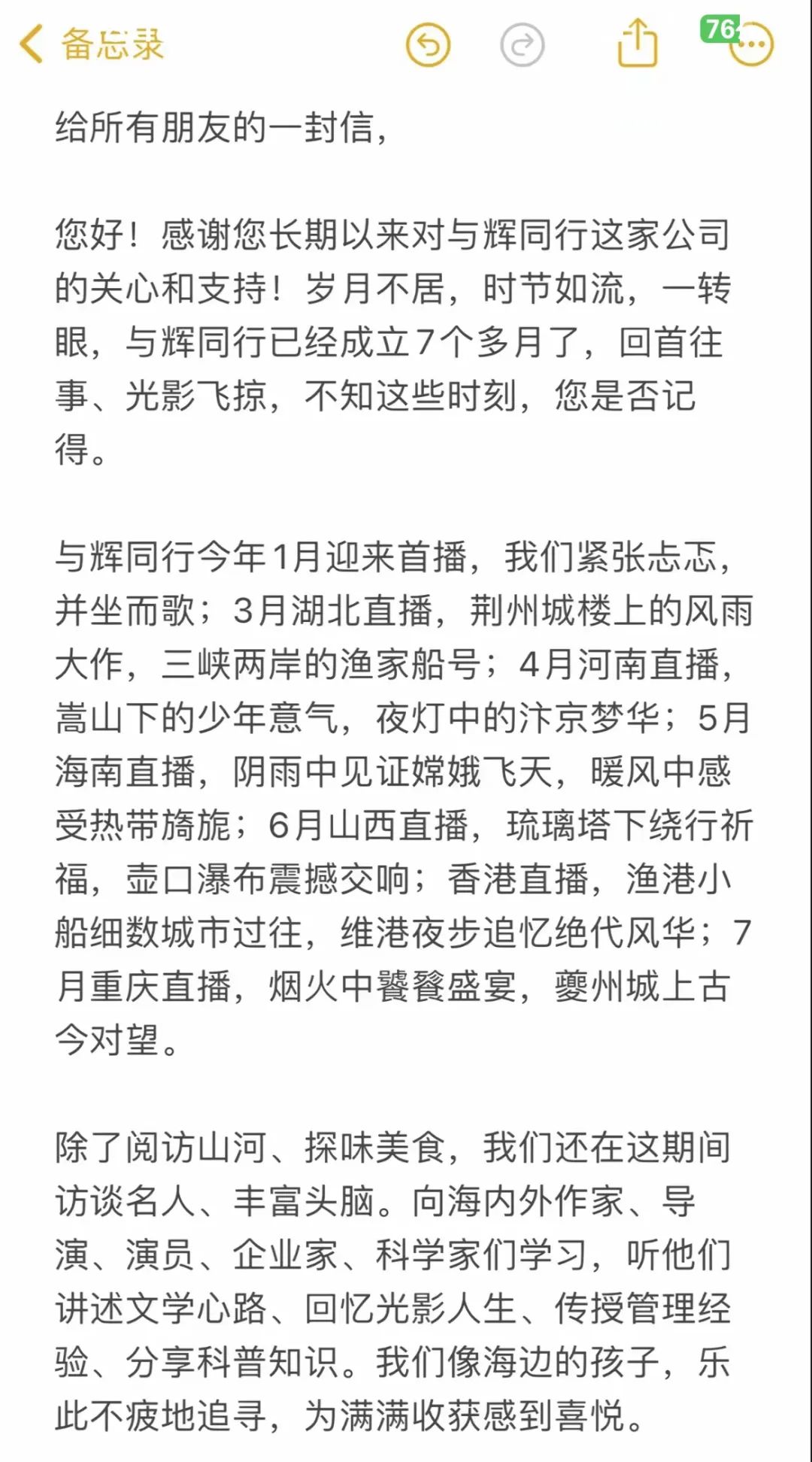 与此同时,董宇辉在社交媒体上发布了《给所有朋友的一封信》。董宇辉称,“在与辉同行公司成立后,我个人及整个与辉同行公司的团队,都得到了很好的待遇提升,俞老师也多次给我们发了超越期待的奖金。另外,收购与辉同行所需的股权购买款,俞老师也按符合上市公司规则和章程规定的方式予以安排结算。与辉同行也将有能力,维持未来一段时间的公司运营及房租,员工工资等支出成本。”