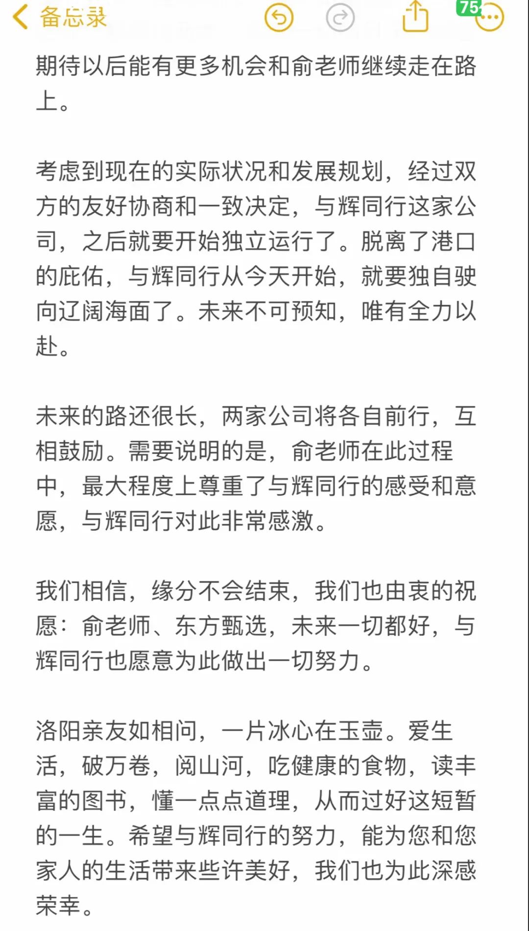 董宇辉称,“经历,形成了过去、决定着现在、影响着未来。我们很幸运,人生路上能够遇到这样的良师益友,直到现在,我无比怀念之前和俞老师一起游山玩水、笑谈一切的日子,我也期待以后能有更多机会和俞老师继续走在路。考虑到现在的实际状况和发展规划,经过双方的友好协商和一致决定,与辉同行这家公司,之后就要开始独立运行了。脱离了港口的庇佑,与辉同行从今天开始,就要独自驶向辽阔海面了。未来不可预知,唯有全力以赴。”