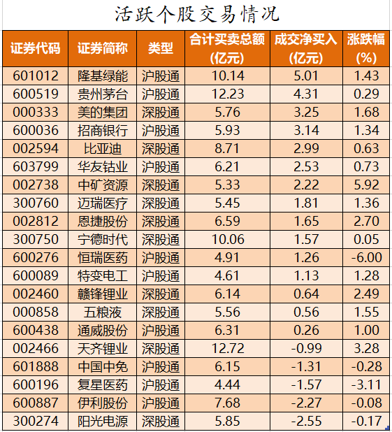 活跃个股方面,北向资金净买入较多的有隆基绿能、贵州茅台、美的集团、招商银行、比亚迪,净买入金额分别为5.01亿元、4.31亿元、3.25亿元、3.14亿元、2.99亿元。北向资金净卖出的有阳光电源、伊利股份、复星医药、中国中免、天齐锂业,净卖出金额分别为2.55亿元、2.27亿元、1.57亿元、1.31亿元、0.99亿元。