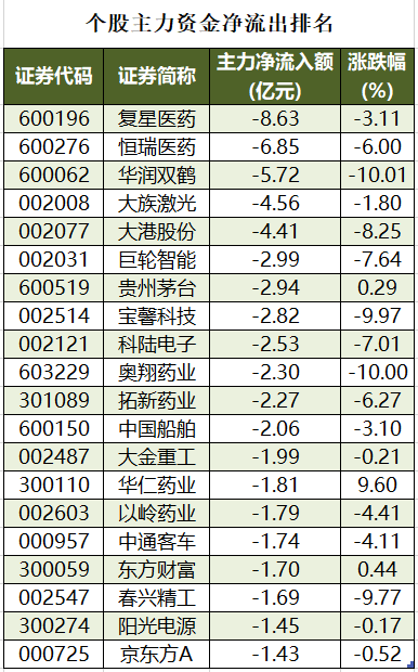 此外,2830只个股被主力资金净卖出,其中,35股被主力资金净卖出超1亿元。主力资金净流出最多的个股是复星医药,净流出金额为8.63亿元;主力资金净流出居前的个股还有恒瑞医药、华润双鹤、大族激光、大港股份、巨轮智能,净流出金额分别为6.85亿元、5.72亿元、4.56亿元、4.41亿元、2.99亿元。