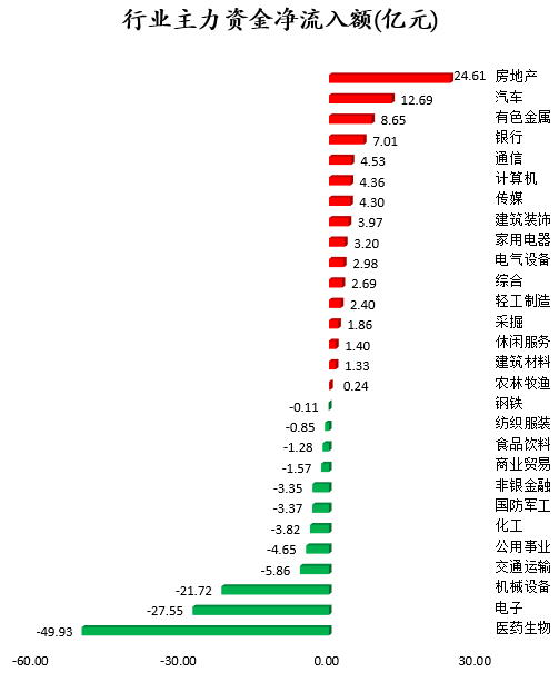 从行业板块来看,申万所属的28个一级行业,今日有16个行业板块主力资金呈现净流入,其中,房地产行业板块主力资金净流入最多,净流入金额为24.61亿元;行业板块主力资金净流入居前的还有汽车、有色金属、银行、通信、计算机,净流入金额分别为12.69亿元、8.65亿元、7.01亿元、4.53亿元、4.36亿元。12个行业板块主力资金呈现净流出,其中,医药生物行业板块主力资金净流出最多,净流出金额为49.93亿元;行业板块主力资金净流出靠前的还有电子、机械设备,净流出金额分别为27.55亿元、21.72亿元。