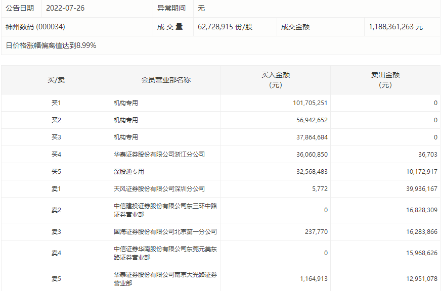 神州数码今天涨停。盘后数据显示,3个机构出现在龙虎榜单上,合计净买入1.97亿元。华泰证券股份有限公司浙江分公司买入3606.09万元,同时卖出3.67万元;天风证券股份有限公司深圳分公司买入0.58万元,同时卖出3993.62万元。