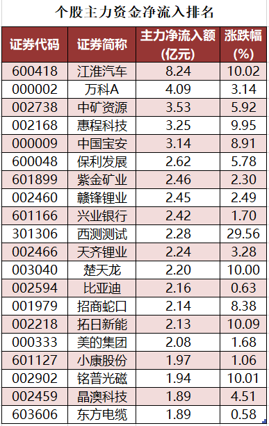 个股来看,今日有1886只个股获主力资金净流入,其中,49股获主力资金净流入超1亿元。江淮汽车获主力资金净流入最多,净流入金额为8.24亿元;主力资金净流入居前的个股还有万科A、中矿资源、惠程科技、中国宝安、保利发展,净流入金额分别为4.09亿元、3.53亿元、3.25亿元、3.14亿元、2.62亿元。